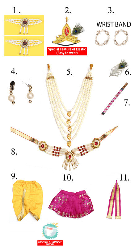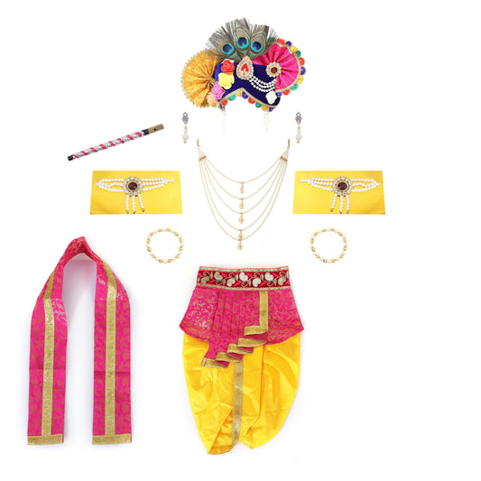 Baby Krishna Dress for Janmashtami with Krishna Mukut, Peacock Feather & Flute - Yellow-Pink