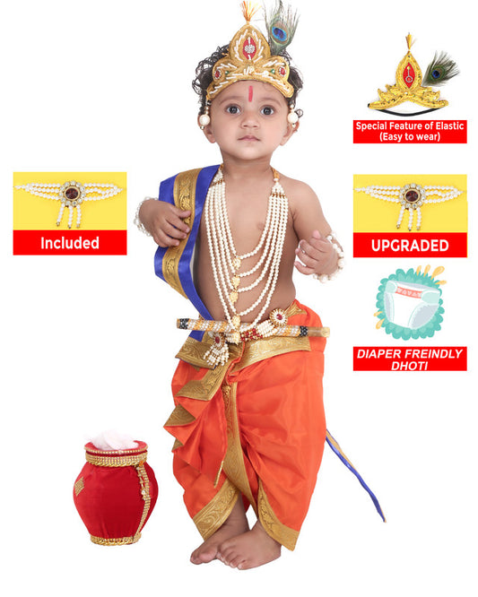 Baby Krishna Brocade Fabric Janmashtami Mythological Character Costume - Orange and Blue