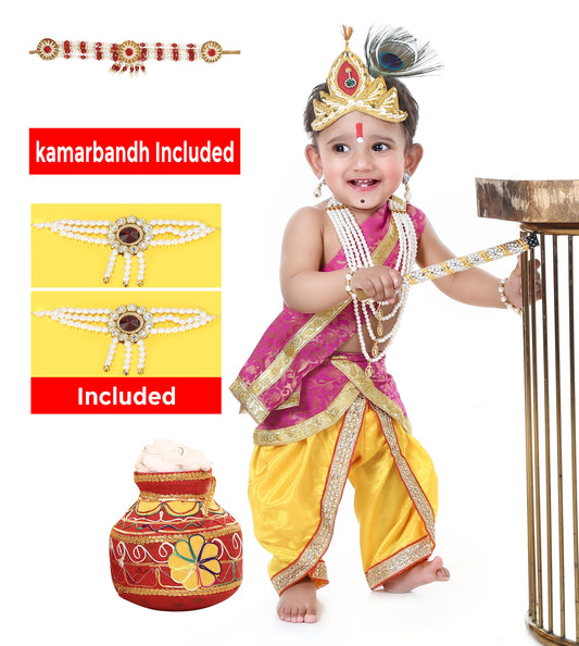 Baby Krishna Brocade Fabric Janmashtami Mythological Character Costume - Yellow and Magenta