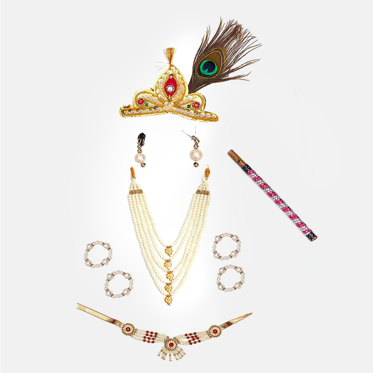 Janmashtmi Dress with Diaper-friendly Dhoti & Dupatta, Mor Pankh Mukut, 5-Layer Mala, Baju Bandh & Bansuri - Jewellery_Kids_FULL