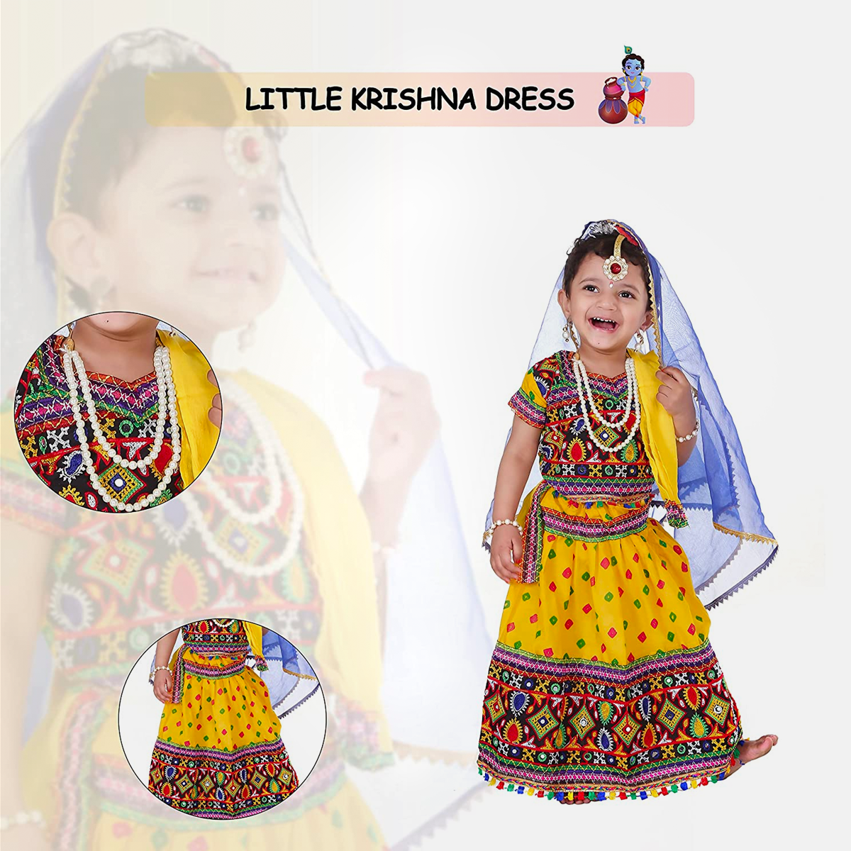 Janmashtmi Dress with Diaper-friendly Dhoti & Dupatta, Mor Pankh Mukut, 5-Layer Mala, Baju Bandh & Bansuri,